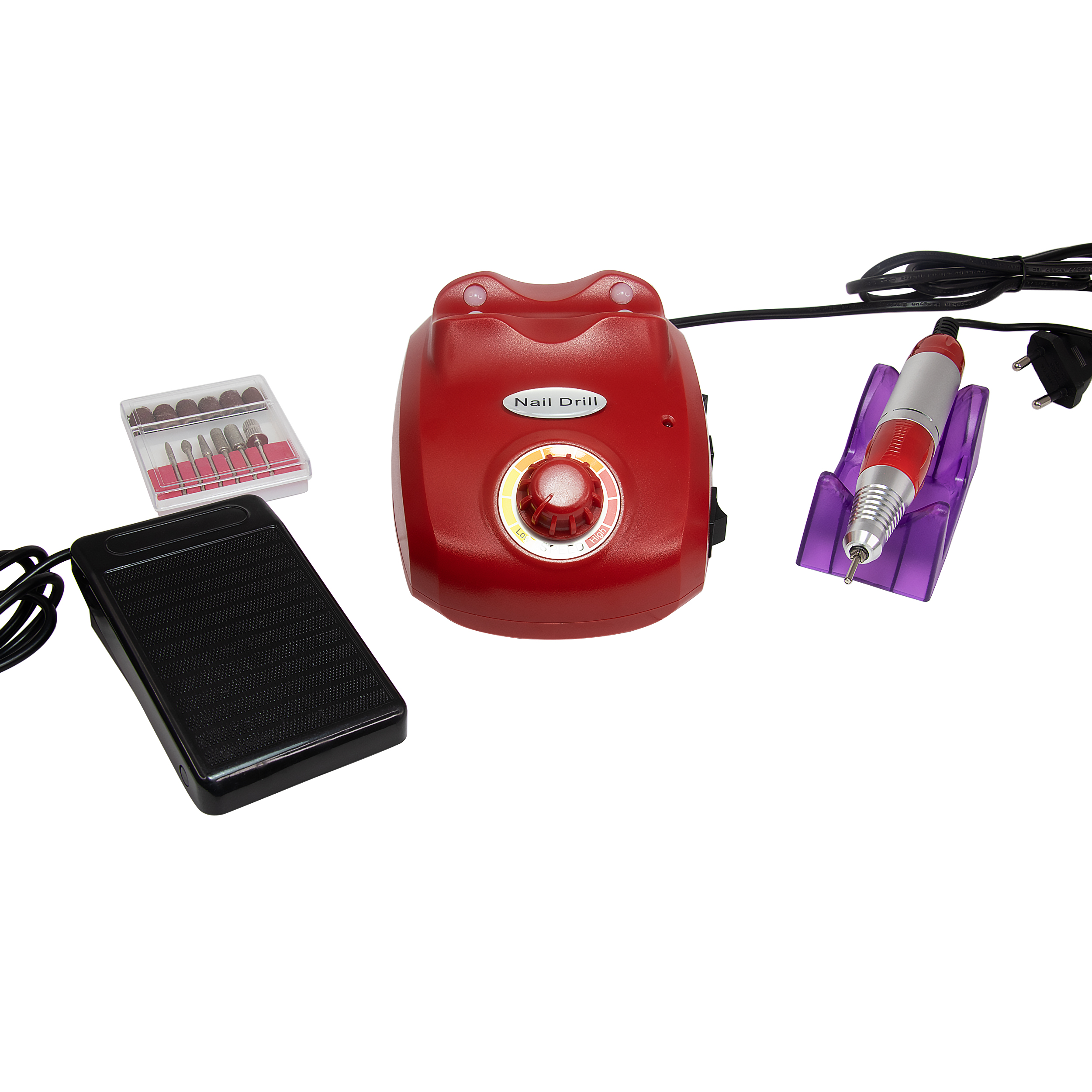 Название продукта: аппарат для маникюра и педикюра Мощность: 45 ватт Скорость вращения: 45000 оборотов/минуту Питание: 50Гц 100-120В,220-240В Размер (ДШВ): 21168 Цвет: красный