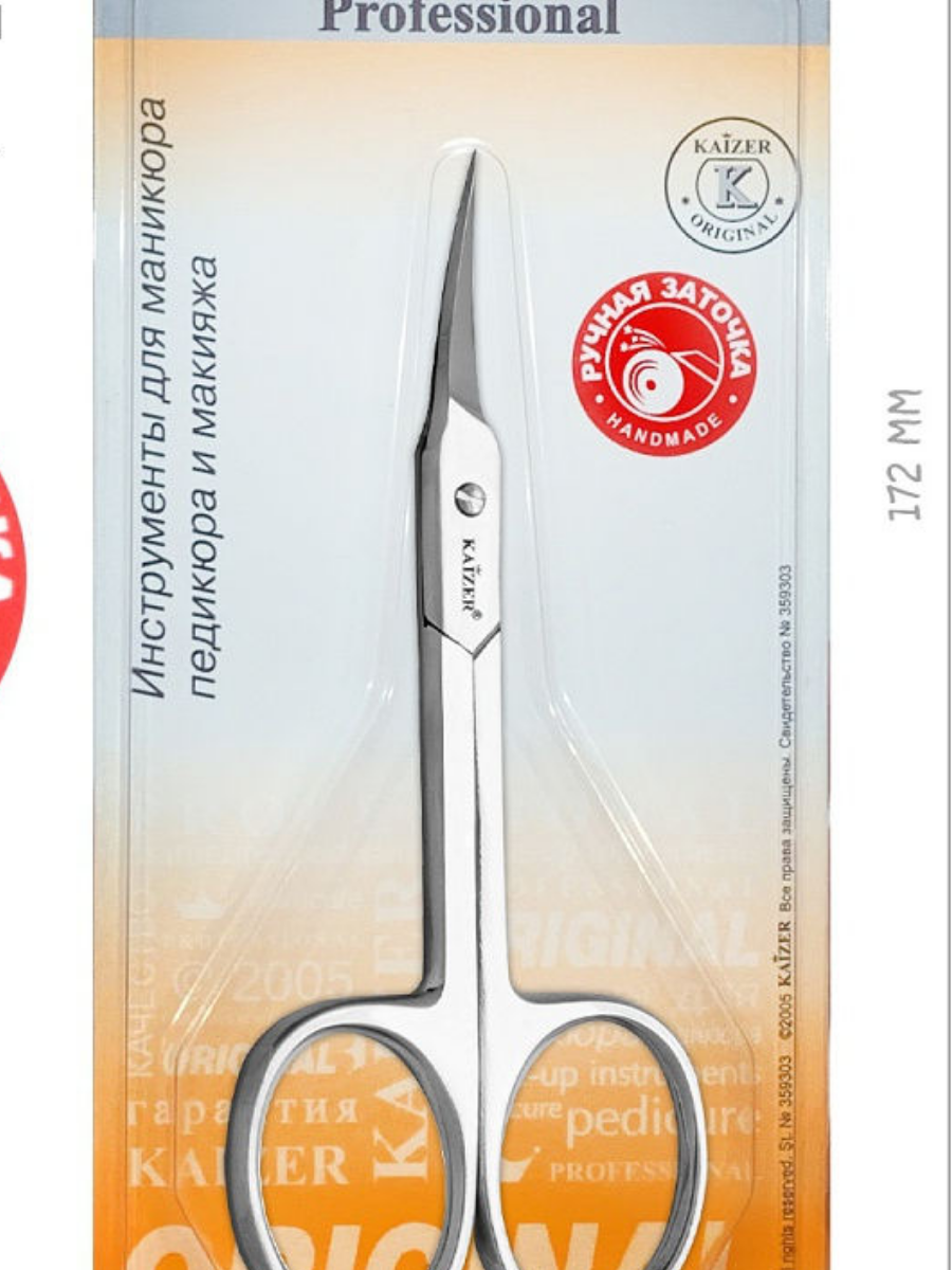 Маникюрные ножницы для кутикулы Kaizer с ручной заточкой 2 см. ножницы Кайзер подходят для мастеров, начинающих мастеров и учеников. Закругленные ножницы Кайзер предназначены для придания аккуратной формы ногтям. Каждый инструмент Kaizer затачивается вручную, это гарантирует остроту лезвий, отрегулированный плавный и ровный ход. В процессе маникюра ногти не заминаются и не ломаются, срез получается точным. Компания Kaizer производит качественные инструменты для маникюра, педикюра, бровей, наращивания ресниц и косметологии. ножницы маникюрные для ногтей подходят для использования в салоне или дома. Профессиональные ножницы для стрижки удобно взять в путешествие или хранить дома, легко мыть и дезинфицировать. ножницы Кайзер долго держат заточку и остаются в первоначальном виде даже спустя несколько лет, также ножницы являются отличным подарком.